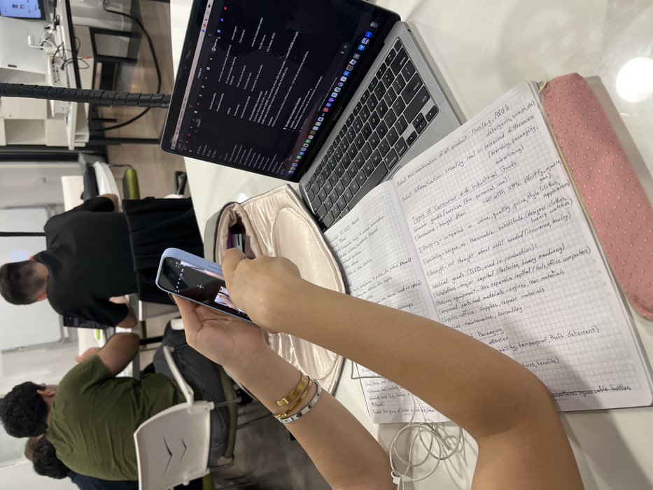 The image depicts an indoor scene within a modern study or collaborative workspace in Yerevan, Armenia. In the immediate foreground, a person's forearms are visible, holding a light blue cased iPhone vertically with both hands, positioned as if capturing an image or video of an unseen subject. The person's left wrist displays two gold-colored bracelets and one silver-colored bracelet. On a white, reflective table surface, an open silver MacBook Pro laptop is positioned to the right, displaying a dark-themed web browser interface. The active tab reads "chat.openai.com" and shows text related to "Financial Accounting," "Auditing," "Tax Accounting," "Cost analysis," "Annual report," and "Internal & independent audits." To the left of the laptop, an open spiral-bound notebook with grid paper is visible, filled with handwritten notes in black ink. Visible text includes headings like "Types of Consumer and Industrial Goods," "Product Differentiation," "Industrial goods (B2B) and in production," "Raw materials," "Operating supplies," and "Services (insurance, law, consulting)." A light pink textured pencil case rests along the bottom edge of the notebook. A beige or light pink padded pouch is situated between the phone and the laptop. Coiled white wired earbuds are also present on the table next to the notebook. In the midground, three individuals are seated at white round tables with white chairs. One person, seen from the back, wears a dark green t-shirt. Another person, also seen from the back, wears a black polo shirt, both appearing to be engaged with laptops on their respective tables. A third individual is partially visible behind the person in the green shirt. The background features a white wall or whiteboard and additional tables with computer monitors, wires, and other technical equipment, along with a black flexible arm or stand extending upwards from a table on the right.