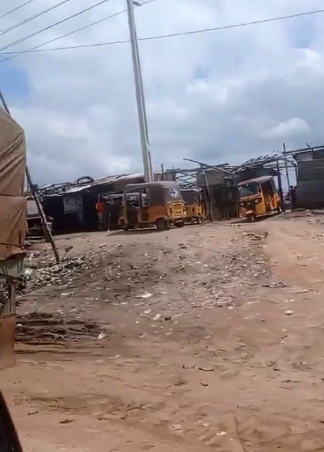The video depicts a scene from what appears to be a market area or a roadside settlement in a developing country