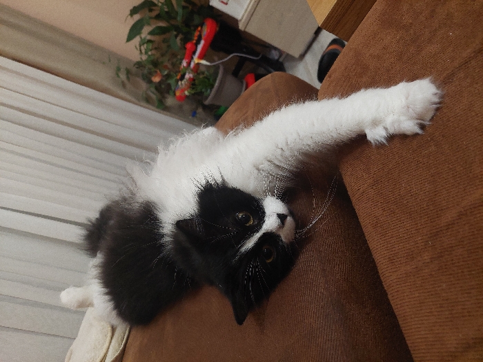 - "A long-haired domestic cat with black and white fur lies supine on a brown, textured upholstered surface, consistent with a sofa" by FM-sWaGl1, licensed under CC BY 4.0