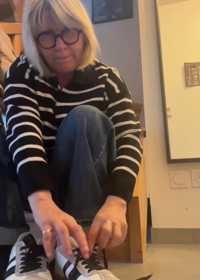 A mid-shot video shows a woman tying the laces of her shoe. She is wearing glasses, a black and white striped sweater, and blue jeans. She is sitting on a wooden staircase. She has medium-length blonde hair. Her shoes are white with black stripes and have thick brown soles. Behind her is a framed picture and a white board. The floor is a light beige tile. She finishes tying her shoe and holds it up, displaying the sole to the camera. She smiles.