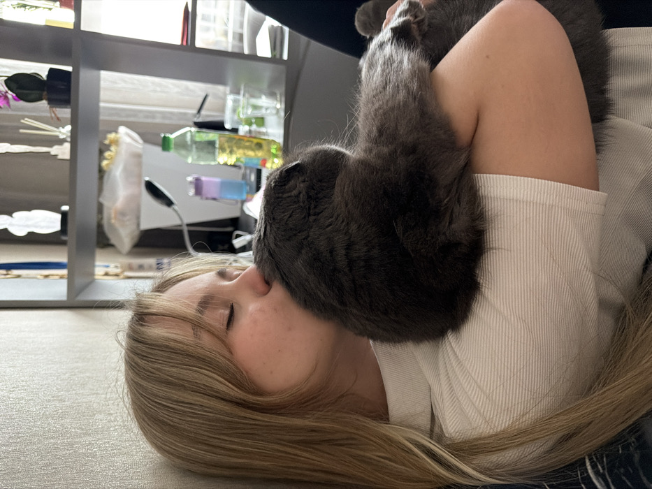 - "An indoor scene depicts an adult female holding a gray domestic cat in a residential setting" by FM-X2IvD2, licensed under CC BY 4.0