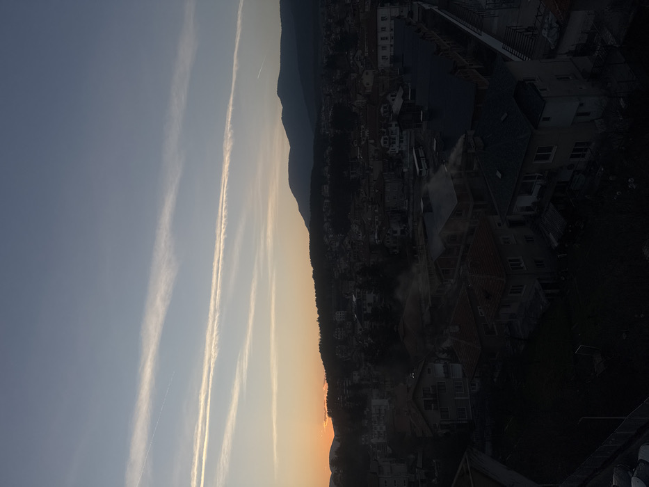 An elevated, wide-angle photograph captures a twilight scene over the city of Velingrad, Bulgaria, at what appears to be sunset. The sky transitions from a light blue at the top to an orange-yellow hue along the horizon on the left side of the frame, featuring multiple elongated cirrus clouds and at least two distinct aircraft contrails. In the mid-ground, silhouetted mountains covered in dense forests define the background. The urban landscape of Velingrad occupies the central and lower portions of the image, characterized by numerous residential and multi-story buildings with varied roof colors, including red-brown tiles and dark grey. White plumes of smoke or steam are observed rising from multiple chimneys and vents across the rooftops, particularly in the mid-ground and foreground. A white passenger bus is discernible on a street among the buildings. The immediate foreground is darker, containing closer residential structures and a partially visible, dark, angled architectural element or ground structure on the far left.
