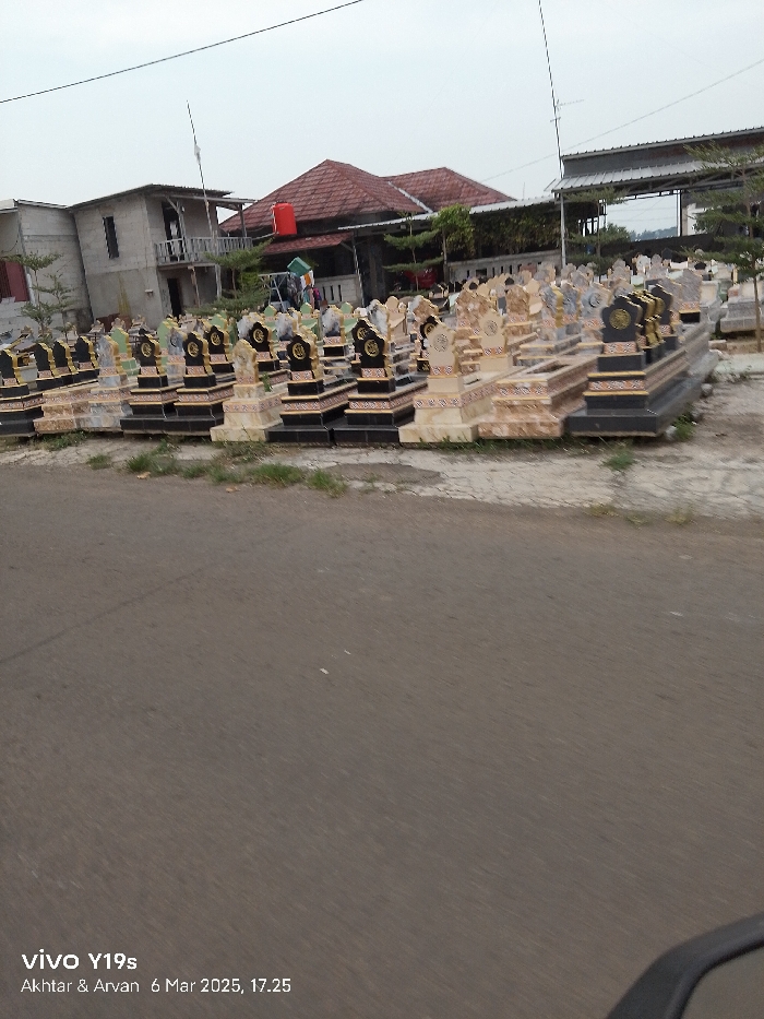 street in Kecamatan Gabuswetan, Indonesia (latitude: -6.43, longitude: 108.012) lined with dozens of new, unburied tombstones. The tombstones are made of a light stone, accented with black marble and gold trim. They are arranged in rows on the unpaved street. There is a concrete building with a red roof in the background. No people are visible in the image. The photo appears to have been taken from a moving vehicle.