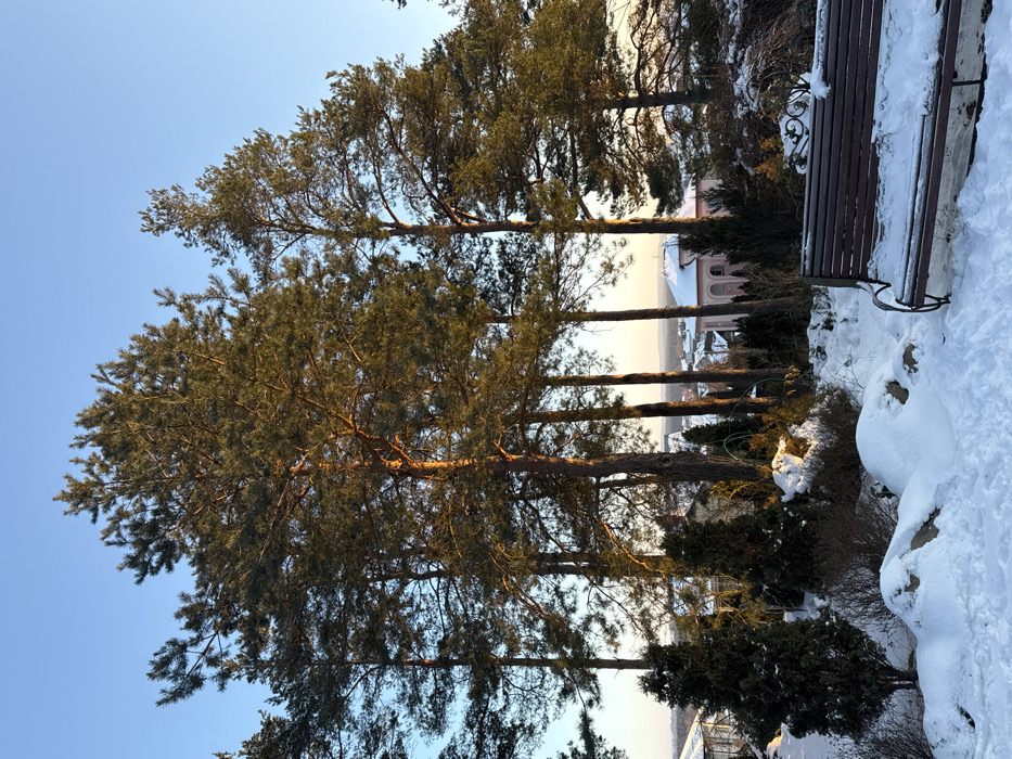 The image captures a winter landscape in Капцёўскі сельскі Савет, Belarus, under a clear, light blue sky with warm, low-angle sunlight. The foreground is covered in a thick layer of undisturbed white snow, interspersed with irregular snow-covered mounds and small, dark green evergreen shrubs. A dark brown slatted wooden park bench with ornate black metal armrests and legs is positioned on the right, its seat and upper parts lightly covered in snow. Dominating the midground is a cluster of tall pine trees with visible reddish-brown trunks and dark green needles, illuminated by golden sunlight. Through and beyond these trees, a distant settlement is visible, featuring various buildings with snow-covered roofs. A prominent light pink or peach-colored building with rounded architectural elements is discernible in the mid-right background. No individuals, actions, or direct interactions are depicted.