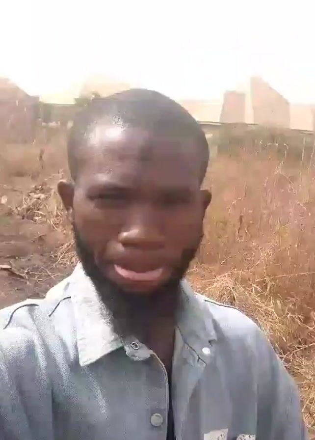 A single man is the main subject of the video. He has dark skin, a short haircut, and a beard. He is wearing a light blue denim jacket with a printed design on it over a dark top. He stands outdoors in what appears to be a grassy field or uncultivated land. The background includes dry, brownish vegetation. In the distance, there is a building. The video is shot from a close-up, first-person perspective, as if the man is recording himself. The lighting conditions suggest it is daytime, but the brightness fluctuates, occasionally obscuring the background. The man does not speak and the camera is stable for a brief moment before it begins to shake slightly, and the man moves.