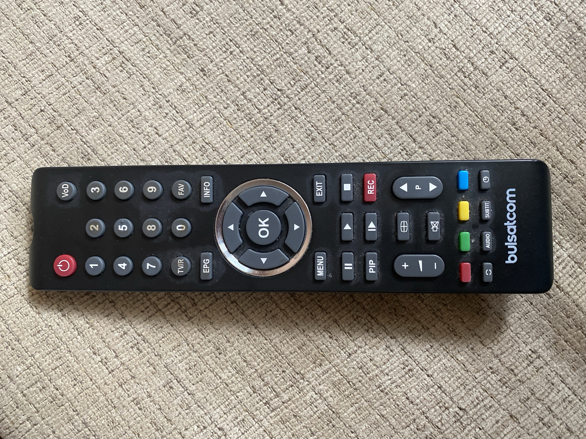 Bulsatcom remote control resting on a textured, neutral-colored surface
