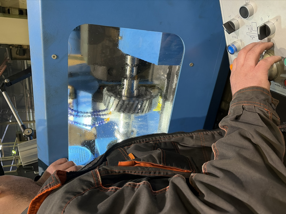 A man operates a machine with a blue casing and clear window showing a complex gear-cutting mechanism submerged in fluid. The machine control panel, with knobs and buttons, is on the right side. The operator's hand is turning a knob. The man wears a gray and black work jacket with orange trim, partially obscuring the view of the machine. Condensation and reflections are visible on the clear window.