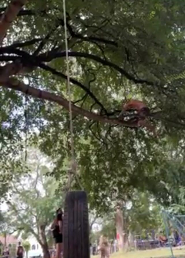 A low-angle shot shows a tire swing hanging from a large tree in a park. A person is lying on a branch, possibly preparing to use the swing. Several people are standing around, observing. The background includes a grassy area, other trees, and park equipment. The day appears bright.