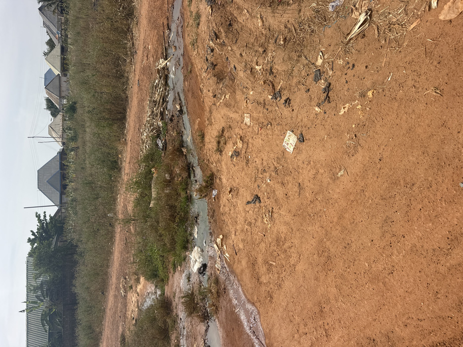 The image portrays an unpaved, reddish-brown dirt thoroughfare in Rido, Nigeria, under an overcast sky. The foreground features a prominent dirt path littered with various refuse, including crumpled papers, black plastic fragments, and dried organic material. A narrow, shallow water channel containing murky, dark liquid flows diagonally across the midground from left to right, bordered by unkempt vegetation and additional litter, notably white plastic bags and a pile of dry plant stalks. Beyond this channel and a stretch of overgrown weeds, several single-story residential structures are visible in the background, distinguished by their sloped, corrugated metal roofs in varying shades. Scattered trees and two slender utility poles are also present in the distance. No individuals are depicted.