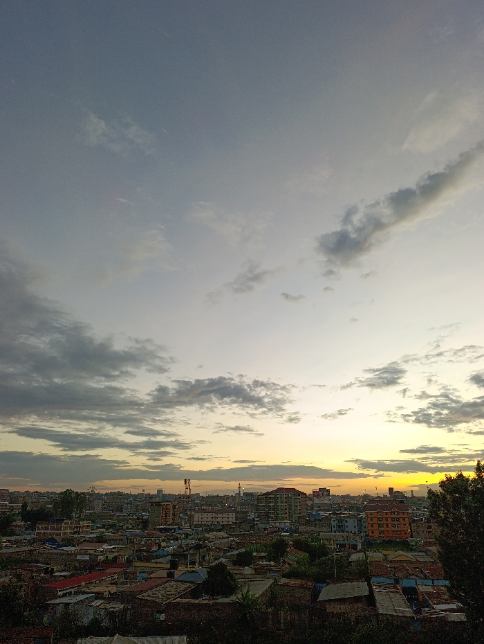 A cityscape under a cloudy sky with a visible sunset glow. Buildings of various heights are nestled closely together, reflecting the warm light of the setting sun. Dark shadows are cast in the foreground, suggesting a low vantage point overlooking the urban sprawl. The sky is filled with a mix of gray and white clouds, hinting at a recent rain or an approaching storm.