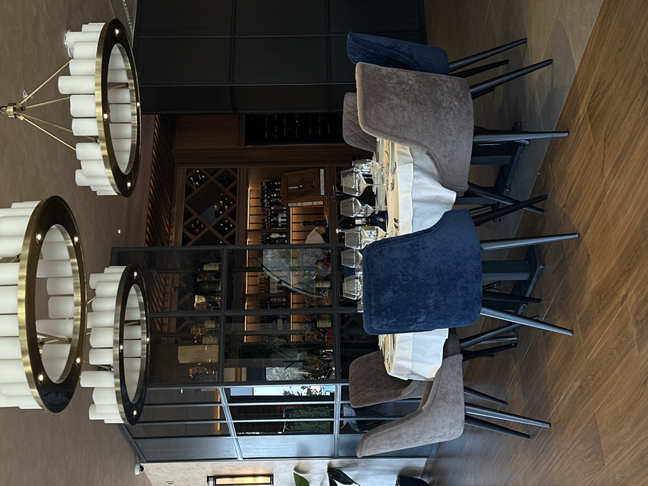 The image displays the interior of a dining establishment in Orahovo, Montenegro. A round dining table, covered with a white tablecloth, is centrally positioned on a dark wood-effect tiled floor. Seven upholstered dining chairs surround the table: four are dark blue velvet, and three are taupe-brown velvet, all featuring dark, slender legs. Each visible place setting on the table includes multiple wine glasses, plates, and cutlery. A small dark blue bottle is located in the table's center. Overhead, three large, circular chandeliers with white cylindrical light diffusers and brass-colored frames are mounted on a light-colored ceiling. The background reveals a glass-paneled display unit containing bottles and decorative items, a wooden wine rack with additional bottles, and sections of dark, paneled walls. No individuals are present in the scene.