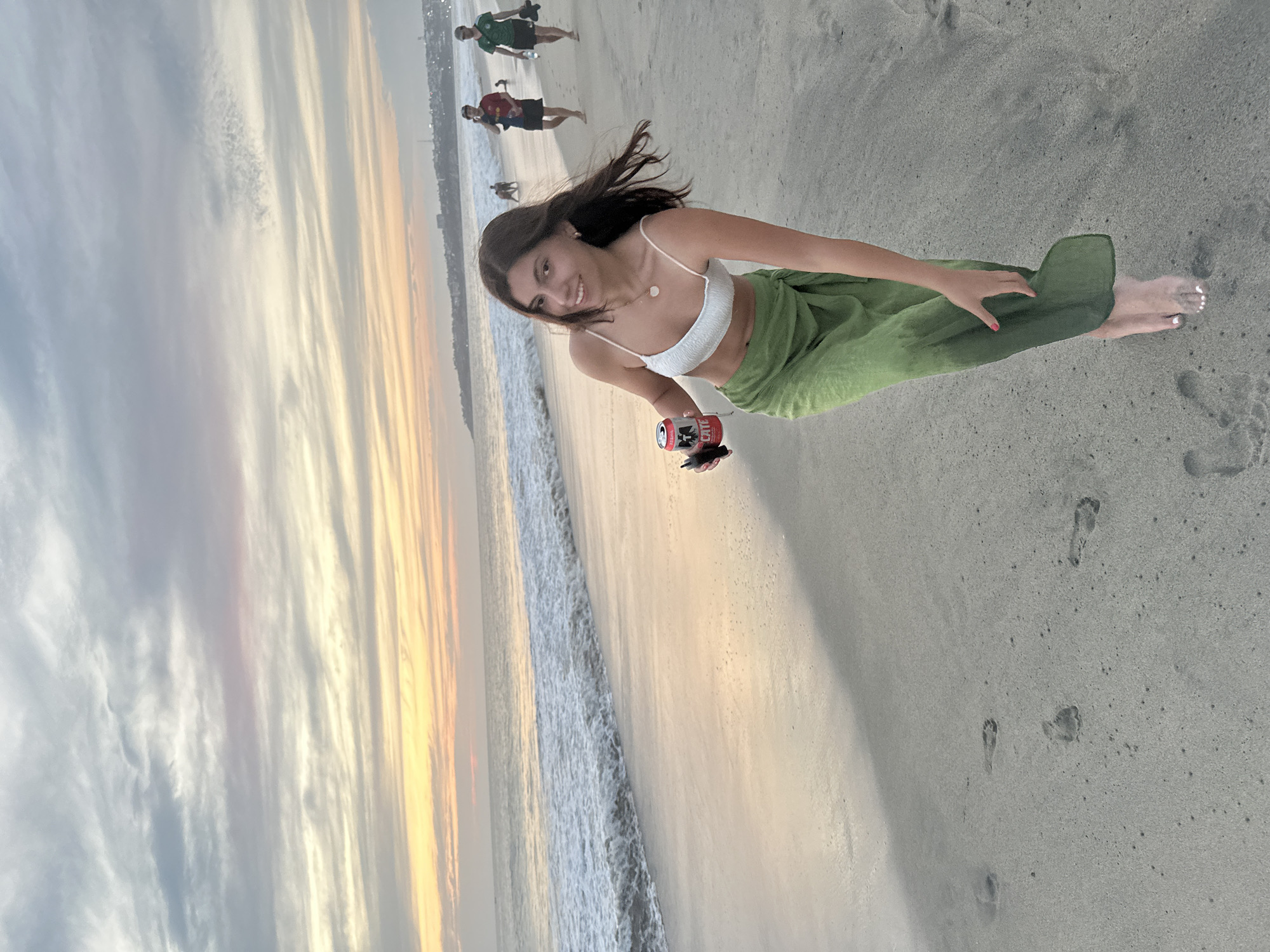 A young woman stands on the beach, holding a beer can. She is wearing a white top and green pants. The beach is located in Brisas de Zicatela, Mexico. There are people walking on the beach in the background. The sky is cloudy with sunset. The ocean is visible in the background.