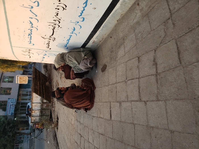 Two individuals sit on a paved sidewalk next to a building. One person is bundled in a brown garment, with a head covering. The other individual sits closer to the wall, covered in a grey cloth. The wall has white and blue writing on it. In the background, there is a road with a vehicle and a bicycle. Trees and buildings are visible on the opposite side of the road.