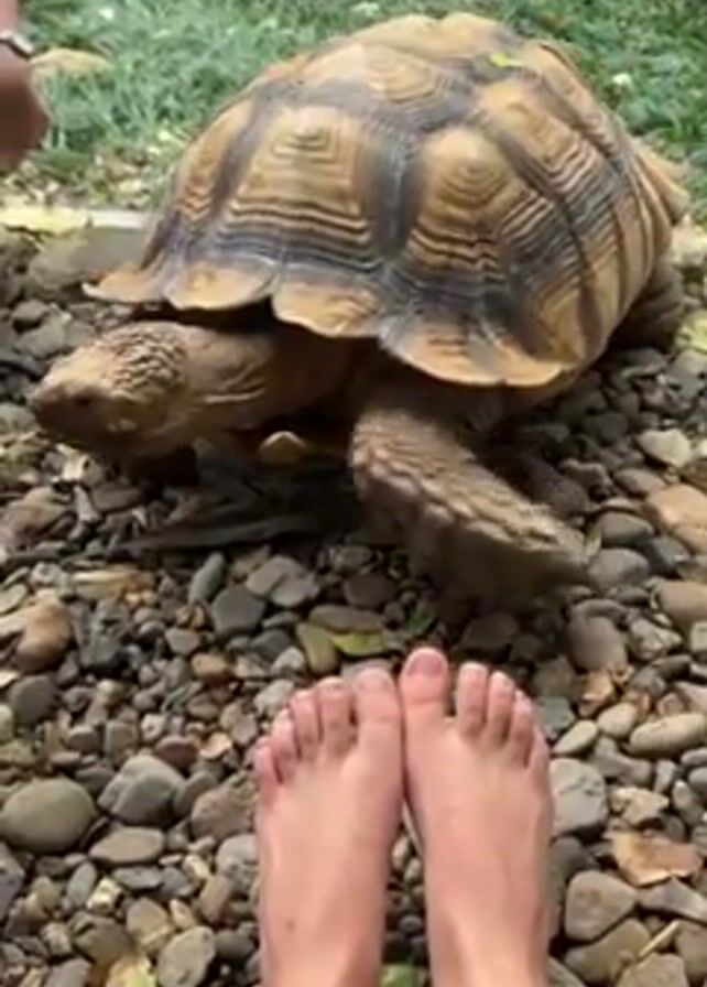 large tortoise, resting on small stones in a natural setting with green foliage in the background. Someone's bare feet are placed in the foreground for scale. Another person, partially visible, is to the side of the tortoise. The tortoise appears to move slightly. At one point someone screams.