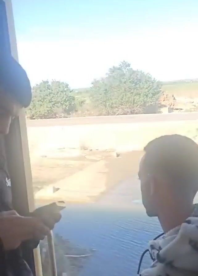 two individuals inside a moving vehicle. One person is looking at a smartphone, while the other is looking out the window. The scenery outside the window includes fields, a road, trees, and a bridge over a waterway. The sky is clear and blue. The vehicle is moving quickly, creating a blurry effect in the view outside the window.