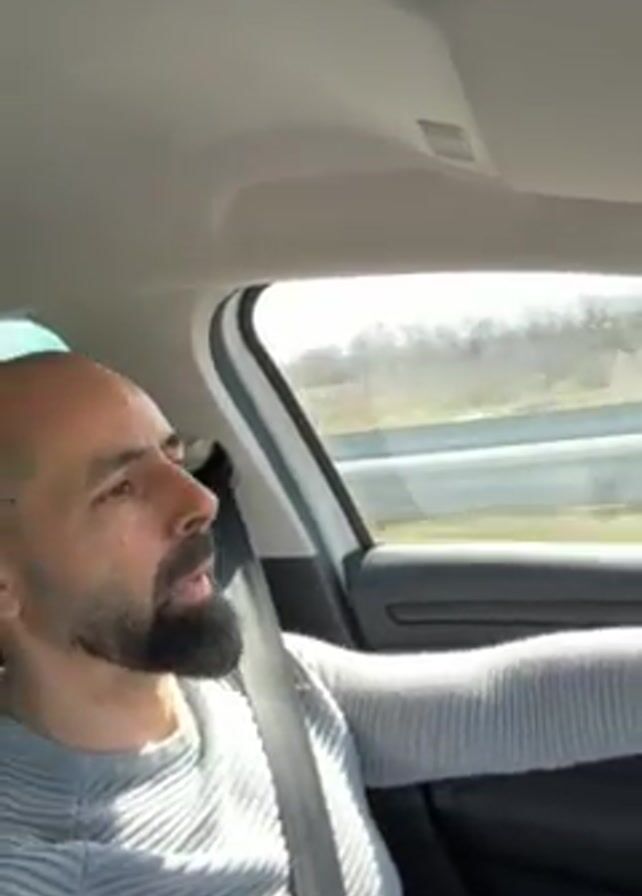 A man is driving a car. He is wearing a light-colored sweater and jeans. He has a beard and short hair. The car is white. The man is looking at the road. The car is moving quickly on a highway. The sun is shining.