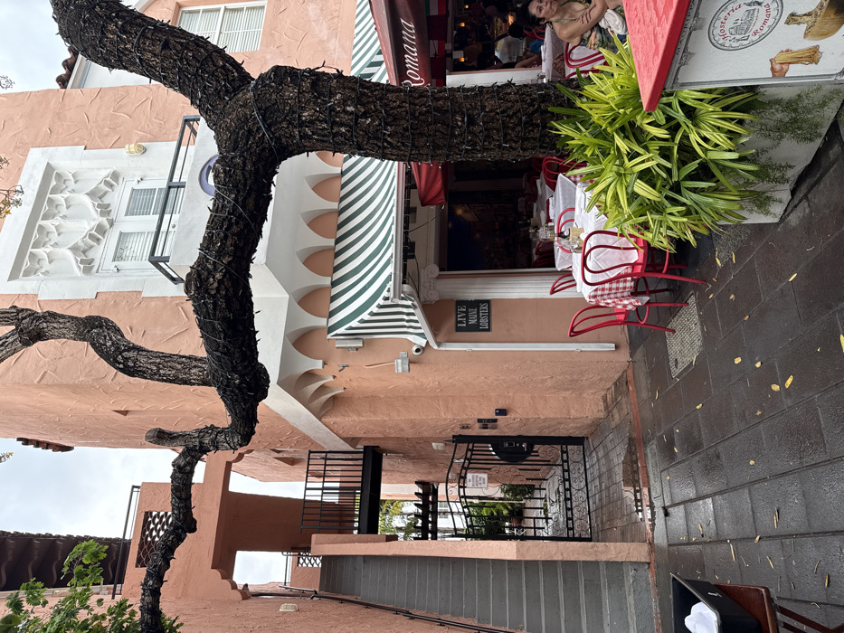 The image depicts an outdoor scene at Osteria Romana, located on Española Way in Miami Beach, United States of America