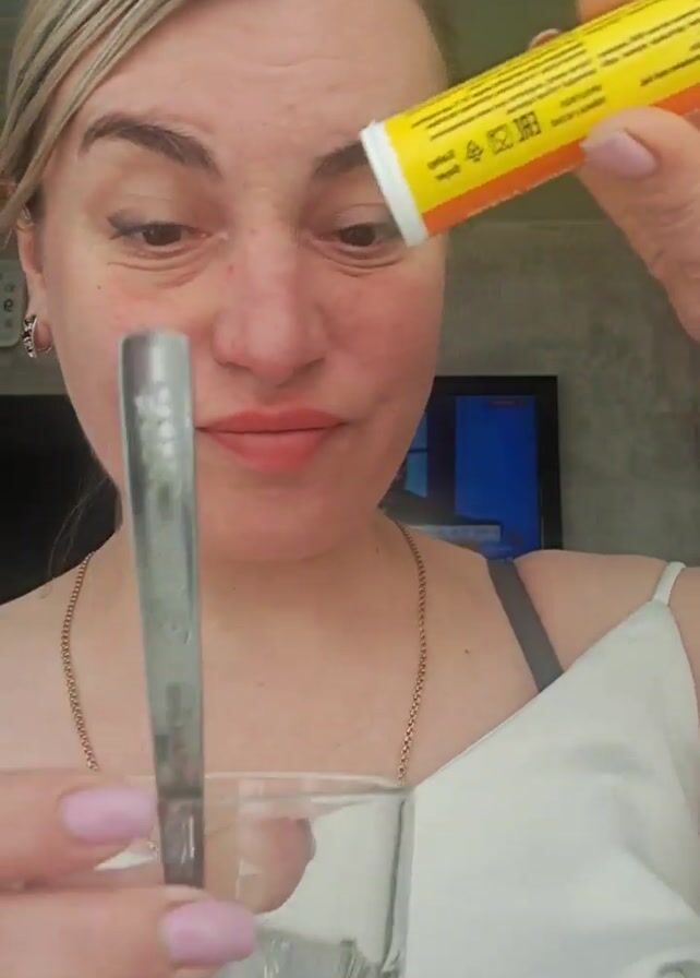 A woman with blonde hair is preparing a drink. She holds a tube of yellow, orange, and white effervescent tablets and a glass of clear liquid, presumably water. She drops a tablet into the glass. The tablet fizzes and dissolves as she stirs the mixture with a spoon. She looks directly at the camera with a slight smile and raised eyebrows throughout the process. She wears a white top, a gold chain necklace, and has pink nail polish. In the background, there's a television screen, a clock, and a neutral-colored wall.
