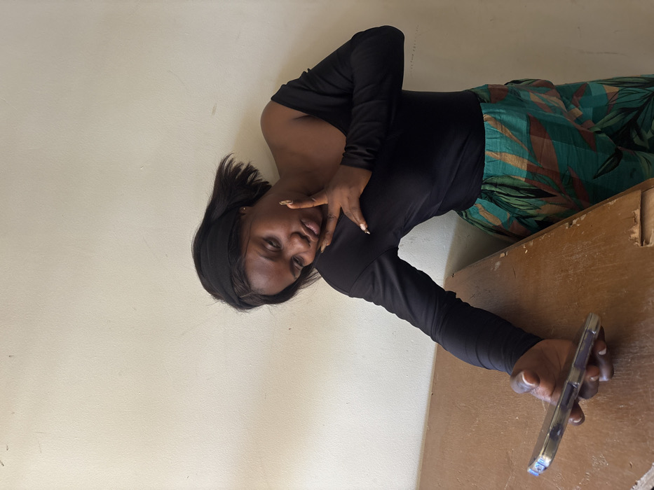 The image depicts an indoor scene in the city of Jos, Nigeria. A young adult female with dark skin, short dark hair, and a black headband is positioned in the foreground. She wears a black long-sleeved, off-the-shoulder top and patterned trousers with teal, brown, and red leaf designs. Her head is tilted left, eyes partially closed, and lips slightly pouted. Her right hand (viewer's left) is raised towards her face, with the index and middle fingers extended in a V-shape; her fingernails are light-colored. Her left hand (viewer's right) holds a silver-colored smartphone with a translucent case horizontally over a worn, light-brown wooden desk or table. The background is a plain, light beige wall.