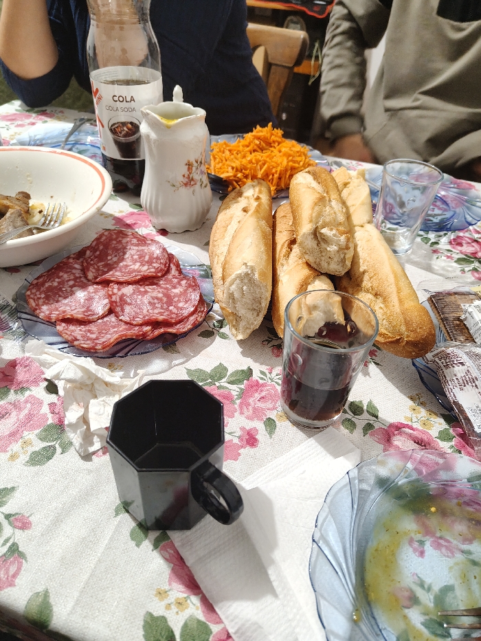 An informal meal is depicted on a table covered by a white tablecloth featuring a pattern of pink roses and green leaves, set in Strasbourg, France. In the foreground, an empty black octagonal plastic mug with a handle rests on the tablecloth. To its immediate right, a clear glass contains a dark red liquid. Further right and slightly forward, a blue-tinted glass plate shows residue of a yellow-green substance, alongside a folded white paper napkin. On the left side of the table, a blue-tinted glass plate holds approximately ten slices of round, reddish cured sausage. Above this plate, a white bowl contains cooked meat or vegetables and a fork, indicating partial consumption. A clear plastic bottle labeled "COLA COLA SODA" is positioned behind this bowl. Adjacent to the cola bottle, a white ceramic creamer with a pink floral design holds a small quantity of yellow liquid. Centrally located on the table is a pile of several baguettes, some whole and some partially broken. Behind the baguettes, a plate contains a mound of shredded orange vegetable, likely carrots. To the upper right, an empty clear glass is visible, next to a blue-tinted plate holding packaged items. Partial views of two individuals are present: an arm wearing a dark blue long-sleeved garment is visible on the upper left, and an arm wearing a beige or khaki long-sleeved garment is seen on the upper right, suggesting occupants seated at the table. A crumpled white paper napkin is situated between the salami plate and the black mug.