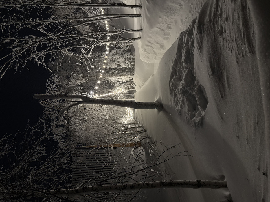 A snowy landscape at night. Trees lined with snow and bare branches reach toward the sky. String lights stretch into the distance, illuminating a path covered in snow. A large snowdrift on the right side of the image reveals a footprint. The darkness and the blanket of snow create a serene and wintry scene.