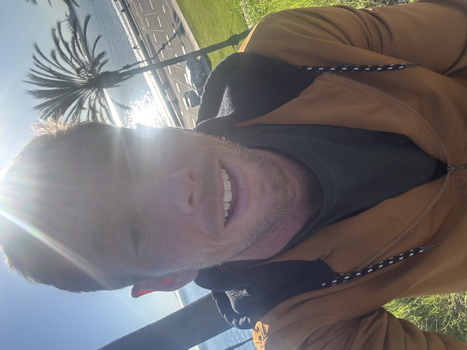 A sun-drenched selfie shows a man with short blond hair and a light beard, smiling. He is wearing a brown jacket over a green shirt. Behind him, a palm tree and a bright blue ocean are visible. The sun reflects off the water, creating a sparkling effect. A road and green grass run alongside the water. The image is rotated.