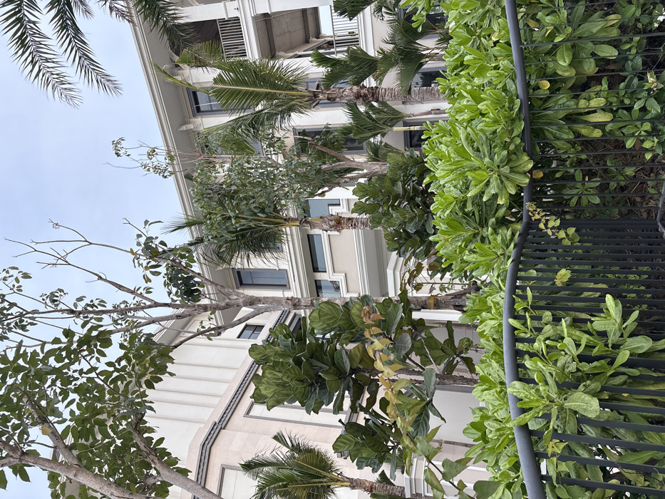 The image displays an exterior scene in Bai Chay Ward, Vietnam, featuring a multi-story building partially obscured by dense tropical vegetation. In the foreground, a dark gray metal fence runs horizontally, behind which is a robust hedge of broad-leafed green plants. Further back, numerous trees are visible, including several tall palm trees with prominent trunks and fronds, as well as clusters of large-leafed plants resembling Fiddle-leaf figs. Other deciduous or semi-deciduous trees with slender trunks and varying degrees of foliage are also present. The building, constructed with light-colored (beige or off-white) facades, features multiple floors with dark-framed rectangular windows. Architectural details include decorative pilasters, cornices, and balconies equipped with railings. Portions of the building's right side exhibit exposed structural elements, suggesting ongoing construction or renovation. The sky above is uniformly light gray, indicating overcast conditions. No individuals or human activity are depicted in the scene.