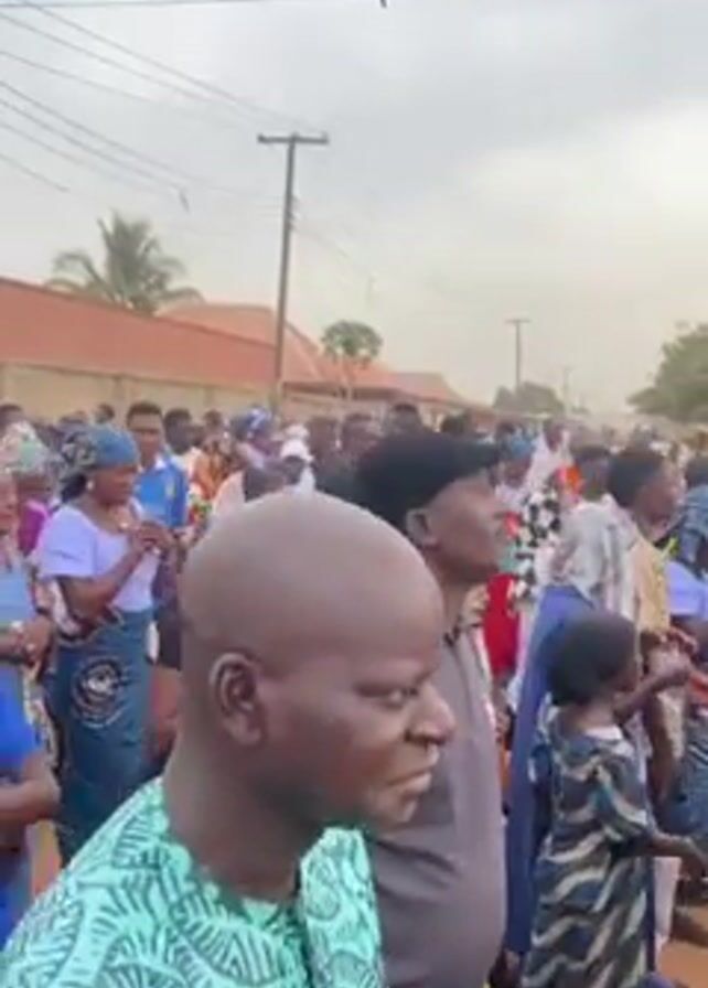 A crowd of people walks down a street in an outdoor setting. The crowd consists of men, women, and children. Many people are wearing blue clothing. The environment is a neighborhood street with buildings, utility poles, and trees visible in the background. The sky is overcast.