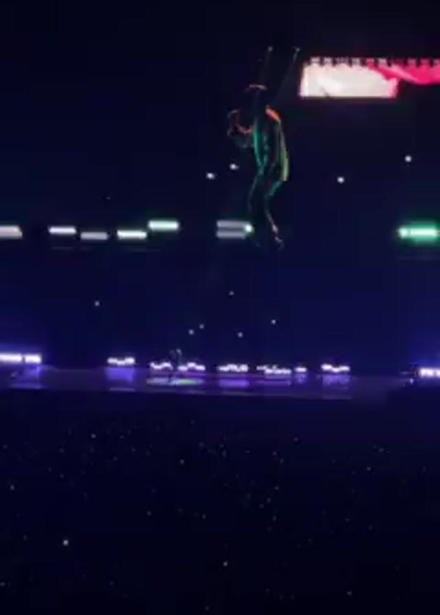 A performer is singing on a stage at a concert. The stage is dark, but has small, lit rectangles in a line. A large screen above the stage shows the performer up close. The screen shows different colors during the concert. The crowd is visible in the dark, in front of the stage.