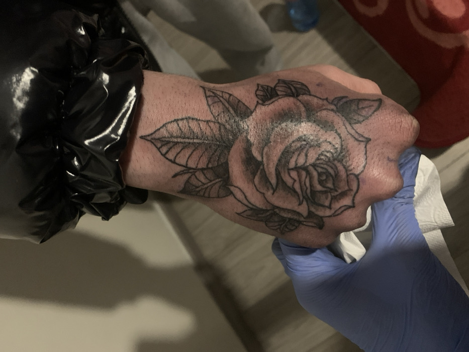 - "An indoor scene in Goliam Izvor, Bulgaria, depicts a close-up view of a person's left hand with a large black ink rose tattoo on its dorsal surface" by FM-fy3YH3, licensed under CC BY 4.0