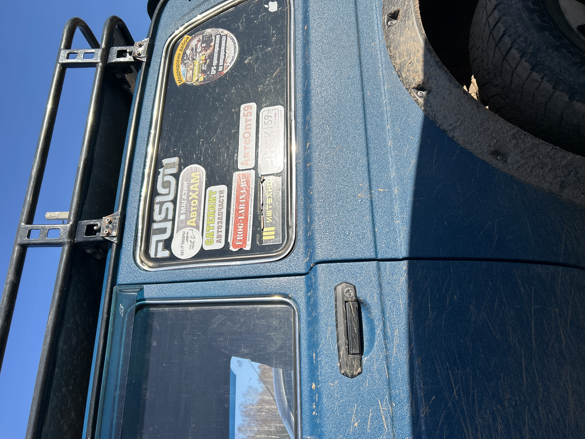 A close-up shot of the blue exterior of a car, likely in Ural'skoe, Russia, based on the Cyrillic text on the various stickers affixed to the window. The window is filled with stickers, including: "FUSION", "МАГАЗИН АвтоХАМ", "САТЕЛЛИТ АВТОЗАПЧАСТИ", "FROG-LABAXARU", "АвтсОпт59", "ИШТЕХНО", "Медведские дебри" with "GPS-ориентирование на внедорожниках". The window is quite dirty. The car appears to be an off-road vehicle, as suggested by the roof rack, mud splashes, and the exposed tire well. A black door handle is visible on the body of the car. The sky is blue and visible in the background near the roof rack.