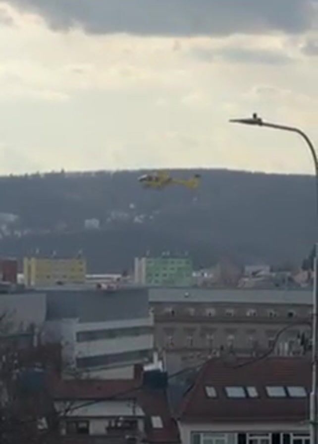 yellow helicopter flying over a cityscape on a cloudy day. The helicopter is in the center of the frame and slightly to the left, moving horizontally across the view. In the background, there are buildings of varying heights and colors, along with a line of trees on a distant hill. A streetlight is in the lower right corner of the frame. The overall tone of the scene is muted due to the overcast sky.