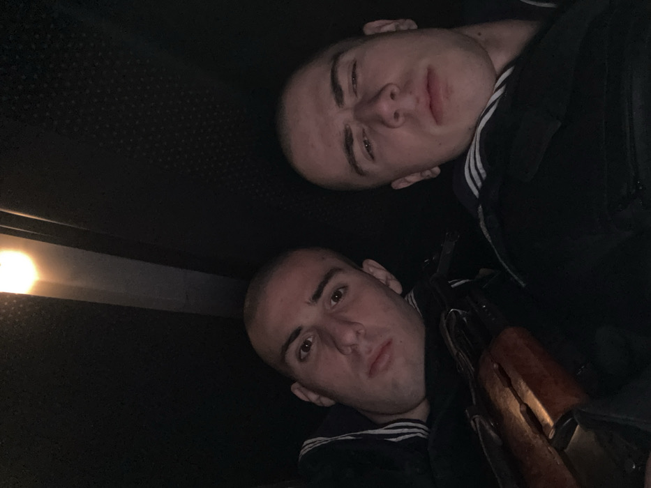 Two young adult males with shaved heads are depicted in a dark, confined space, possibly an interior cabin or vehicle, in Provadia, Bulgaria. Both individuals are wearing dark uniforms with white striped sailor collars. The male on the left has dark eyes and is looking directly at the camera with a neutral expression. An AK-style rifle, featuring a brown wooden handguard and gas tube, is visible resting horizontally across his lower chest. The male on the right, partially obscured by the frame, also looks towards the camera with a slightly strained or squinting expression. An overhead light source illuminates the scene from the top center. No discernible interaction between the subjects is evident beyond their shared presence in the frame.