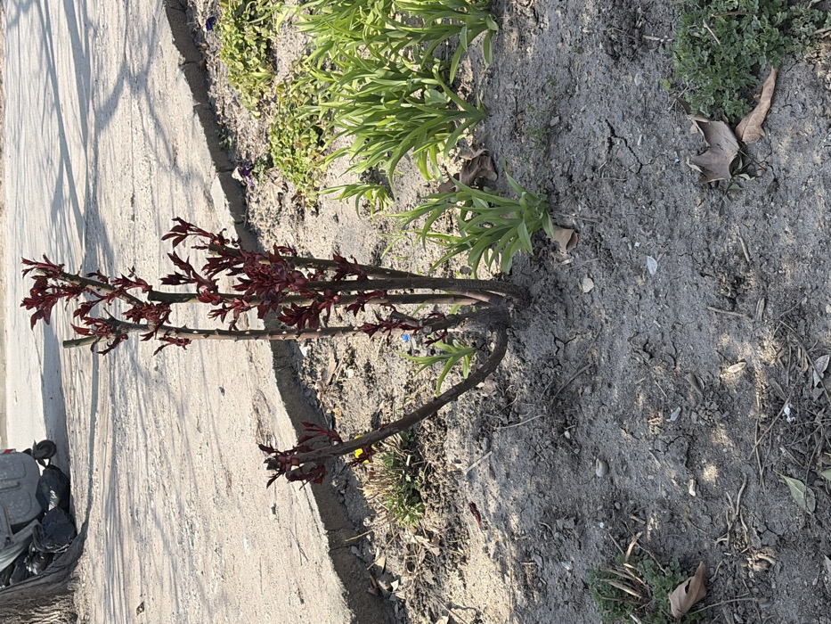 This image captures an outdoor urban scene in Plovdiv, Bulgaria, illuminated by bright sunlight creating distinct shadows. In the immediate foreground, a multi-stemmed plant with numerous dark red, unfurling leaves and buds dominates the frame, rooted in dry, light brown soil exhibiting surface cracks. Scattered across the soil are a few dried leaves and small twigs. To the right of the central plant, several clusters of nascent green, blade-like foliage are visible. A concrete curb defines the boundary between this planted strip and a light-colored, unpaved dirt or gravel path in the midground, which shows faint surface irregularities. In the left background, partially shaded, a gray, wheeled metal dumpster is present, positioned next to a tree trunk (mostly obscured) and accompanied by several black plastic trash bags piled beneath and beside it. No human or animal subjects are visible, and no actions or interactions are depicted.