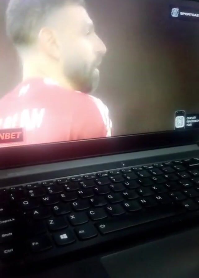 A video shows a laptop screen displaying a live broadcast of a soccer game on Sportcast. The time on the screen is 70:30. The camera focuses on people in the stadium, including a bald man in a black jacket who raises his hand to his face. The laptop keyboard is visible in the foreground.