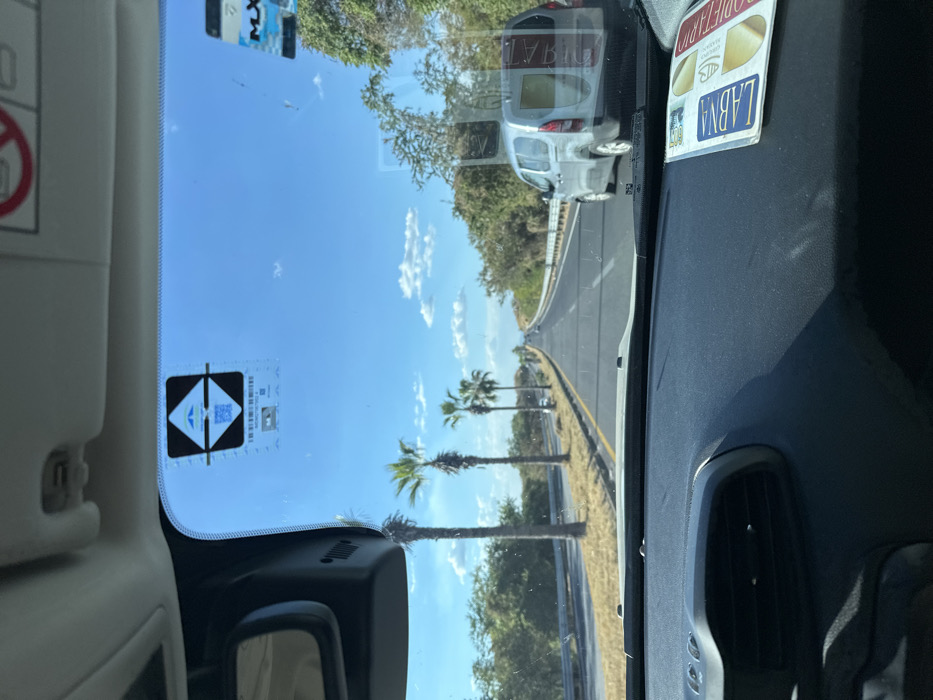 View from inside a car driving on a sunny road. Palm trees line the roadside. A white van is visible ahead. Stickers are on the windshield. The car's interior features a dark dashboard and light-colored trim. Clear blue sky with scattered clouds is seen through the windshield.