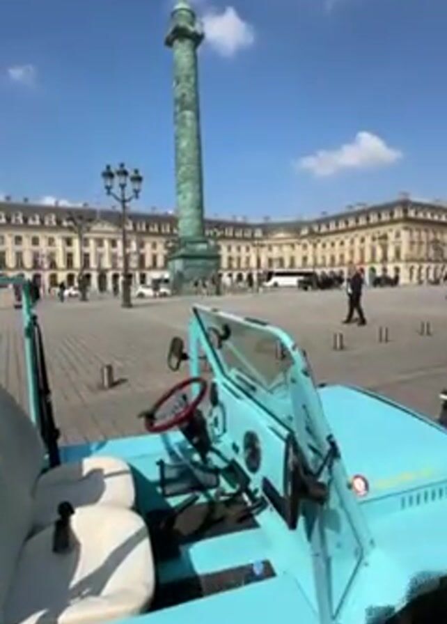 light-blue vehicle parked in a large plaza with a tall, green column in the center. The plaza is paved with grey stones and surrounded by buildings. Several people are walking around the plaza. The sky is blue with a few white clouds. The video appears to be taken from the vehicle, panning upward to show the plaza and column.