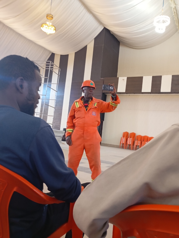 The image captures an indoor scene in Jos, Nigeria. In the midground, a dark-skinned male subject stands, wearing an orange industrial coverall with reflective stripes on the sleeves and a logo patch on the left chest, along with an orange hard hat featuring a green sticker. He holds a black smartphone horizontally with both hands, positioned to record or photograph. In the foreground, the left profile of a dark-skinned male, with a beard and wearing a dark blue long-sleeved ribbed top, is visible, seated on an orange plastic chair. To the far right, the arm and partial torso of another individual, clothed in light-colored fabric, are seen, also seated on an orange plastic chair. The environment features a room with a white draped ceiling, from which two decorative chandeliers hang. The walls display a pattern of alternating dark brown and light beige vertical panels. In the background, to the right of the standing individual, a stack of multiple orange plastic chairs is present, and to the left, a metallic frame structure is visible.