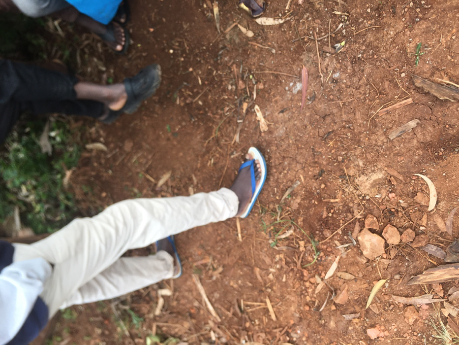 This image depicts an outdoor ground scene in Rigoma ward, Kenya, focusing on the lower extremities of three individuals standing on reddish-brown soil