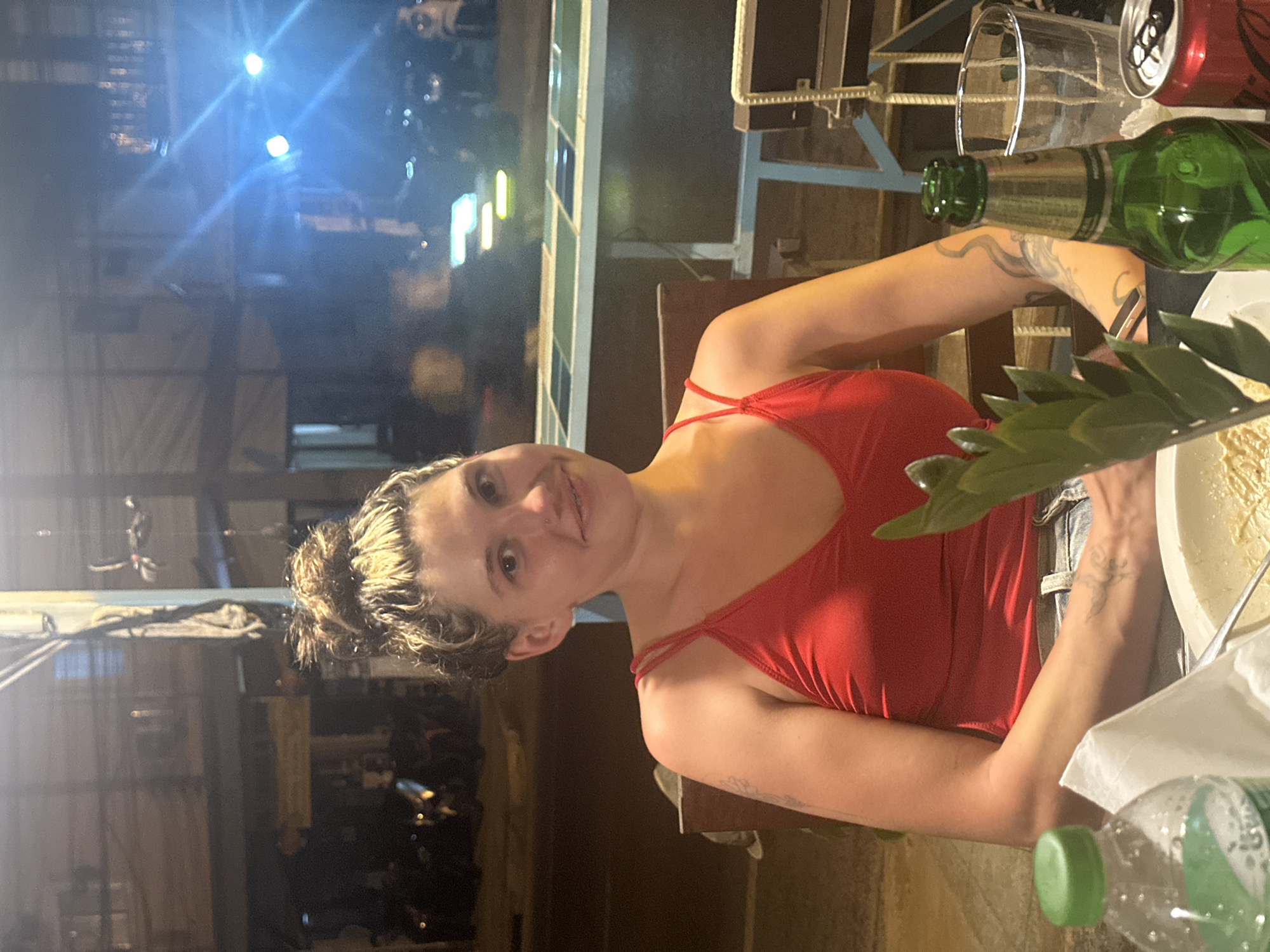 woman sitting at a table, likely outdoors, in Baan Tai, Thailand. She is wearing a red top and has her hair up in a bun. On the table are a plate of food, a green bottle, a can of soda, a glass, and a bottle of water. In the background, there is street lighting and various motorbikes, suggesting an urban environment.