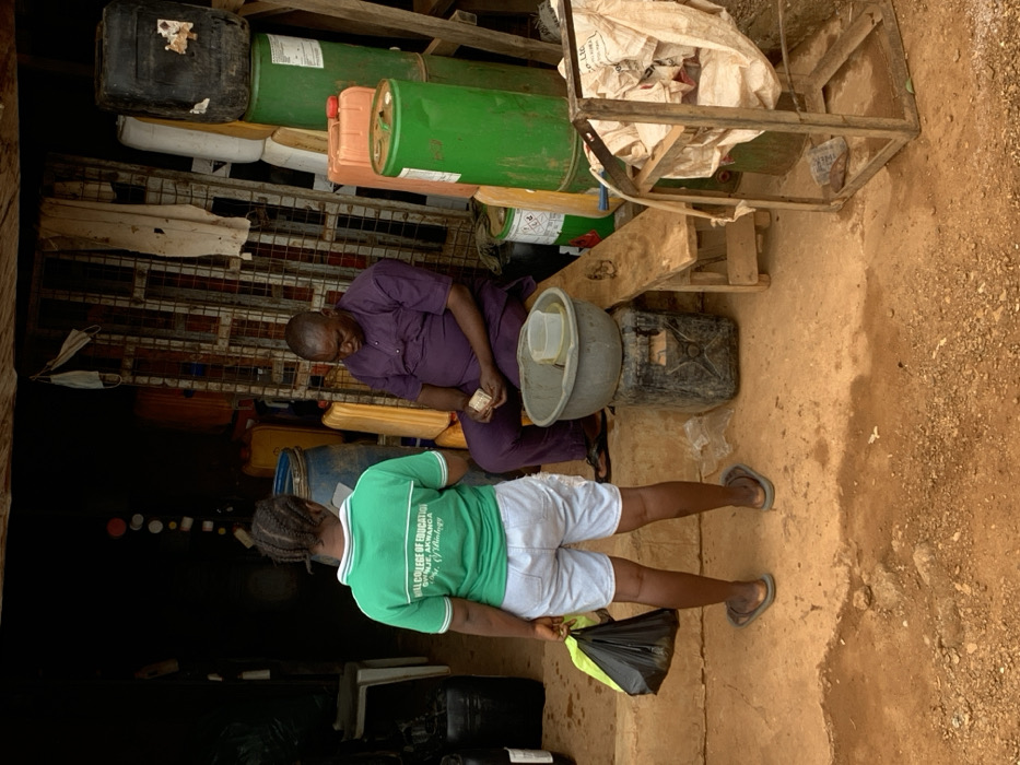 The scene depicts an outdoor commercial transaction in Ube, Nigeria. A young female, viewed from behind, stands on reddish-brown packed earth, facing an older seated male. She wears a green short-sleeved shirt with "HILL COLLEGE OF EDUCATION ONIJE, AKWANGA DEPT. OF BIOLOGY" printed in white on the back, light-colored shorts, and dark flip-flops. Her left hand holds a crumpled black plastic bag. The male, seated to her right, wears a purple short-sleeved traditional garment and looks down at a small, light-colored rectangular object (possibly currency) held in his hands. He is positioned in front of a dark shop interior. To the left of the male, a grey plastic basin containing a clear plastic measuring jug rests on a black plastic jerrycan. A narrow wooden plank-bench is adjacent to this setup. The shop entrance and interior are packed with various items: stacks of green, orange, black, and white plastic jerrycans and barrels; a large blue plastic barrel; and a metal shelving unit from which a white cloth and two white disposable face masks hang. On the far right foreground, a metal frame supports a large, off-white, possibly woven sack. The ground consists of uneven, reddish-brown earth, with a slight elevation leading to the shop area.