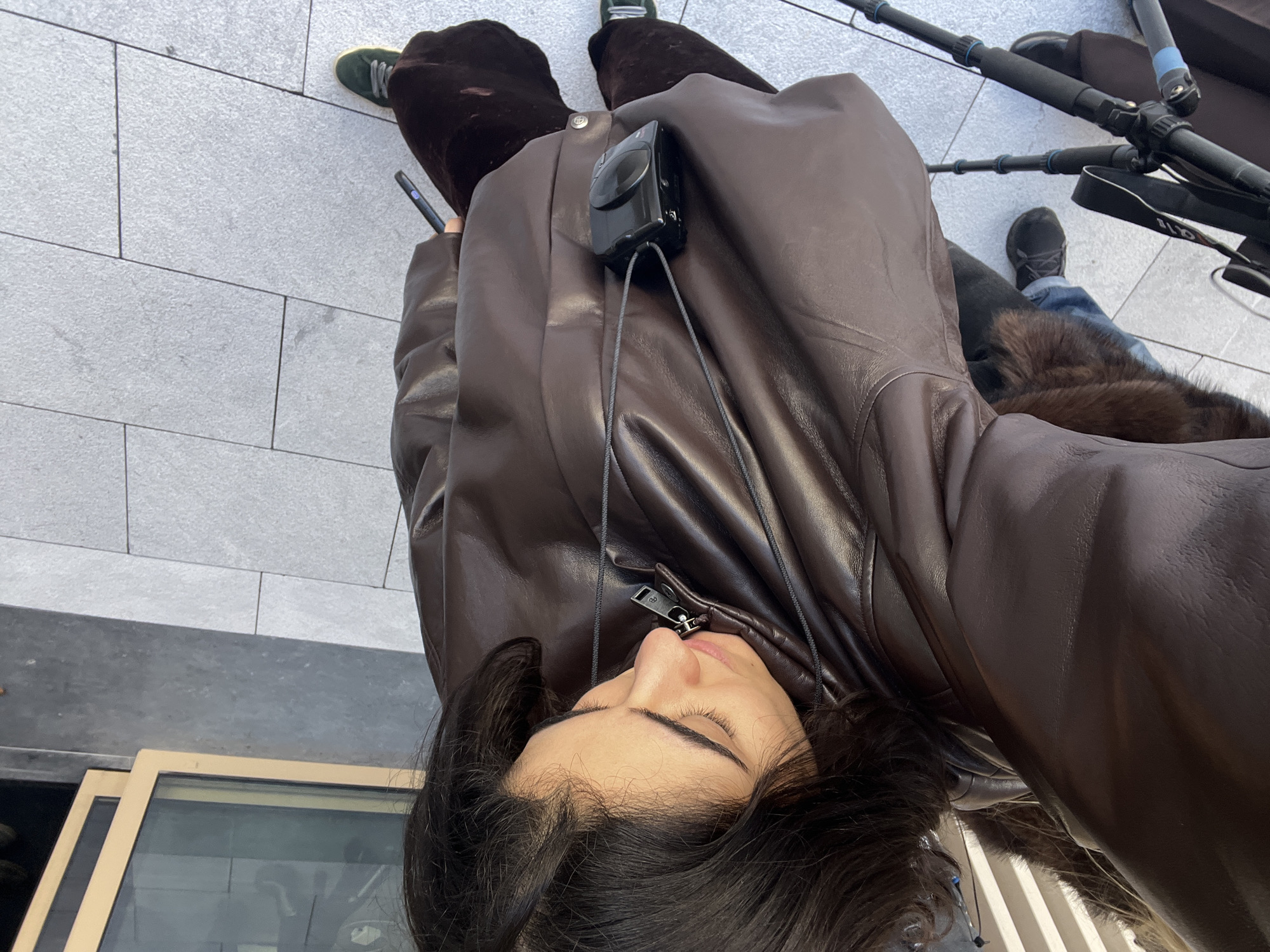A woman is lying down on a gray tiled surface. She is wearing a brown leather jacket with a black electronic device hanging from her neck. To her right are tripod legs. One shoe is visible on each side of her, a green shoe on the left and a black shoe on the right. The tiles appear to be outdoors, possibly in Spa, Belgium.