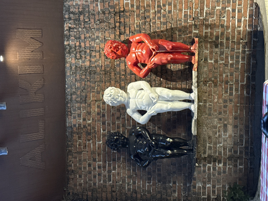 The image displays an outdoor scene in Dongguan, China, featuring three "Manneken Pis"-style statues mounted against a reddish-brown brick wall. Above the wall, a dark brown facade features the raised metallic letters "ALIKIM", illuminated by an overhead light source. The three statues are arranged horizontally on a narrow ledge. From left to right, they are: one glossy black, one matte white, and one glossy red. Each statue depicts a nude, cherubic male child in a posture consistent with urination. Visible streams of liquid are actively emanating from the genital area of each statue, flowing downwards onto the brickwork below. These streams are clear against the darker brick and cast faint shadows. In the lower foreground, a red and white checkered surface, likely a tablecloth, is partially visible. A dark, rounded object, possibly a pot or container, rests on this surface. The overall lighting suggests an evening or nighttime setting, with artificial illumination highlighting the statues and the "ALIKIM" sign. No human individuals are present in the frame.