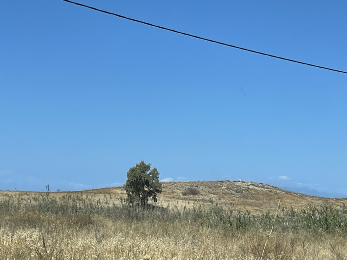 The image depicts an expansive, arid landscape under a clear, bright blue sky in the Municipal Unit of Corinth, Greece. A single, dark utility wire traverses the upper portion of the frame diagonally from left to right. The foreground is dominated by dry, golden-brown grasses and mixed vegetation. In the midground, a small, isolated deciduous tree with green foliage stands on a low, rolling hill covered in similar dry vegetation. On the crest of this hill, slightly to the right of the tree, a small, indistinct light-colored structure or object is visible. Distant, hazy mountains are faintly outlined on the horizon, primarily to the right. No individuals, animals, or active interactions are present. The scene is illuminated by natural daylight.