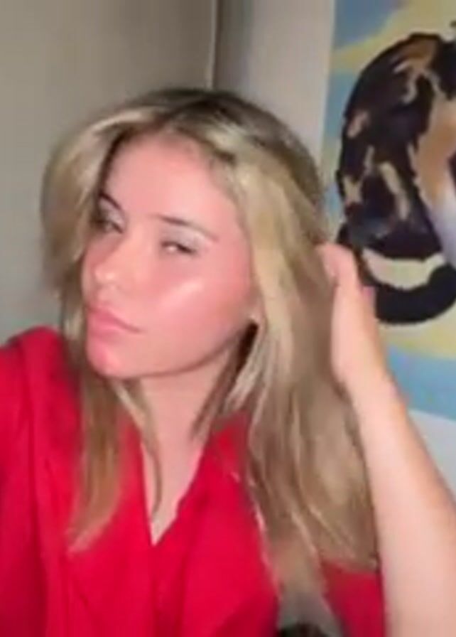 A young woman with blonde hair is looking at the camera while touching her face, seemingly posing. She is wearing a red long-sleeved shirt. A painting of a calico cat sits behind her. The background is a white wall with a door on the left. The room appears to be indoors. Upbeat music plays in the background.