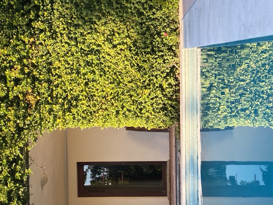 This image depicts an outdoor scene in Ponte de Lima, Portugal, under direct sunlight. A rectangular swimming pool with light blue water and light-colored coping occupies the lower third of the frame. The pool's surface reflects the adjacent structures and foliage. Above the pool, a light-colored building wall is visible on the left, featuring a dark-framed glass door that reflects outdoor greenery. To the right of the door, a dense, vibrant green wall of foliage, likely a climbing plant, covers a vertical surface. An overhang or pergola, similar in color to the building wall, extends from the left and is also partially covered by green foliage, with a white, circular light fixture mounted beneath it. A small, dark, folded object, possibly a chair, is partially visible between the door and the green wall. A solitary small red or pink flower is present at the base of the green foliage wall, near the right edge of the frame. No individuals are present.