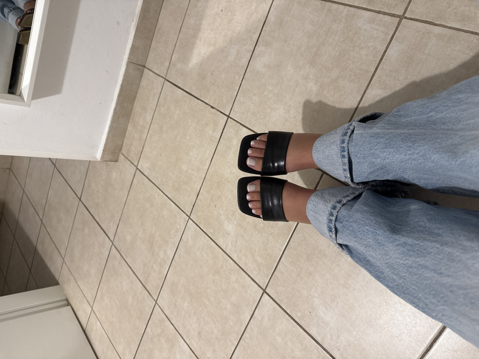 The image depicts a first-person, downward-angle view of a person's lower legs and feet resting on a tiled floor in an indoor setting within Holon, Israel. The individual wears light-wash denim jeans with cuffed ankles and black, square-toed, open-toed slide sandals. The toenails are painted with white polish. The floor consists of light beige square tiles with dark grey grout lines. In the background, to the left, a portion of a white door and doorframe is visible. To the right, a white wall with a beige baseboard features a rectangular white-framed mirror, reflecting a fragmented view of a leg and sandal. The scene is illuminated by interior lighting.