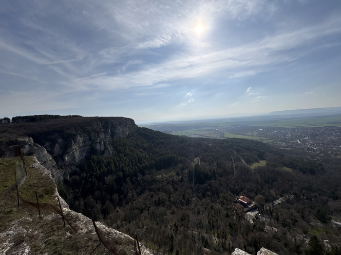 The image presents a panoramic, elevated view overlooking the Madara Plateau and surrounding landscape in Madara, Bulgaria, under bright daylight with a partially cloudy sky. In the immediate foreground, a rusty, wire mesh fence with vertical metal posts runs along the jagged, rocky edge of a cliff, where sparse dry vegetation is visible. To the left, a massive, sheer grey rock cliff face descends sharply, topped by a dense, dark green forest. Directly below and extending into the midground, a deep valley is heavily forested with deciduous trees, appearing mostly bare or with minimal foliage. Within this forested area, towards the center-right of the midground, a multi-story building with a distinctive reddish-brown tile roof is visible, accessible by a winding paved road that snakes through the trees. The background reveals a sprawling rural landscape. To the right, a densely packed village or town, consistent with Madara village, displays numerous light-colored rooftops among its structures. Beyond the village, a mosaic of agricultural fields, some appearing green and cultivated, others fallow and brown, stretches towards a hazy horizon line marked by distant hills or mountains. A faint linear feature, possibly a river or road, can be discerned traversing the plains. The sky occupies the upper half of the image, featuring scattered, wispy white clouds against a pale blue backdrop, with a prominent, bright sun in the upper right quadrant. No individuals or specific activities are observed.