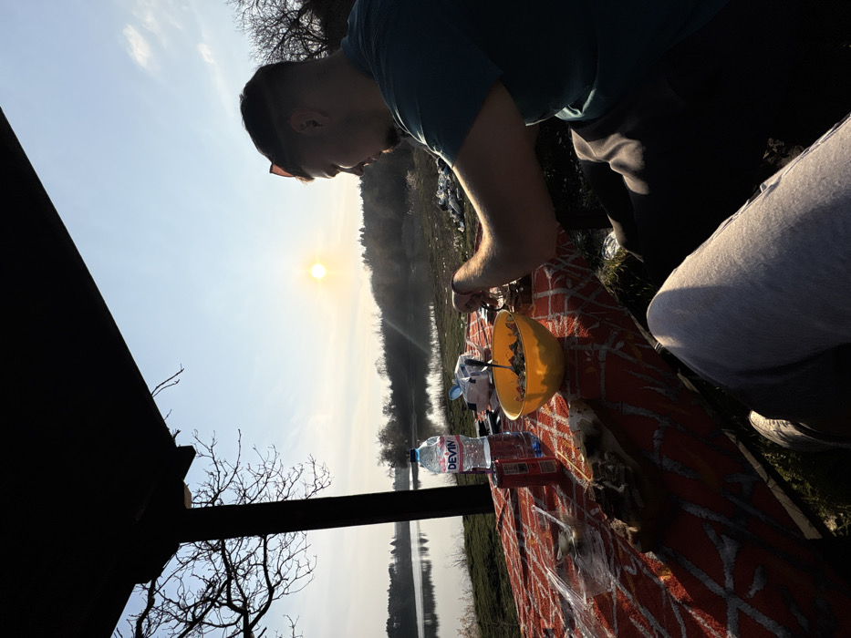 The image depicts an outdoor scene at sunset near a body of water in Popovo, Bulgaria. A male individual is seated at a picnic table covered with a red and white patterned cloth, facing left. He has dark, short hair, a beard, and wears a dark teal t-shirt and dark trousers. Sunglasses are pushed onto his head. His right arm is visible, engaged with items on the table, possibly eating from a large yellow bowl containing salad or food with a spoon. The lower legs of a second person, wearing light grey trousers and dark shoes, are visible in the foreground, suggesting they are seated opposite the first individual. On the table, alongside the yellow bowl, are a plastic bottle of "DEVIN" branded water, two red aluminum beverage cans, a clear plastic bag containing food items (possibly bread or grilled meat), and a white packet (likely napkins or wipes). The table is situated under a dark overhead structure or canopy, with a dark vertical support post visible on the left. The background features a calm body of water (likely a lake or reservoir) reflecting the sky. The far bank is lined with bare deciduous trees and some visible refuse or debris. The sun is low on the horizon, slightly left of center, casting a bright orange glow across the water and through the trees, indicating either late afternoon or early evening. The sky is clear blue with minimal cloud cover. The ground around the table is covered in grass.