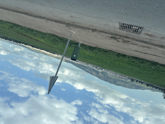 The image depicts an oblique, wide-angle view of a peri-urban landscape on the outskirts of Fez, Morocco, under a bright, cloudy sky. In the foreground, a dark gray asphalt road surface with a visible rectangular metal storm drain grate transitions to a light brown dirt and gravel shoulder. Adjacent to the shoulder, a vast field of vibrant green vegetation, interspersed with small yellow flowers, dominates the midground. Within this field, towards the right, a dark green waste bin marked with a white four-leaf clover symbol is mounted on a slender pole. Immediately to its right, a gray, triangular road sign, displaying its rear face, is affixed to another pole, leaning slightly rightward. Beyond the field, a sprawling urban settlement characterized by numerous light-colored buildings extends across the base of distant, verdant mountains. The sky overhead is a bright blue, dotted with scattered white cumulus clouds. No individuals or discernible activities are present in the scene.